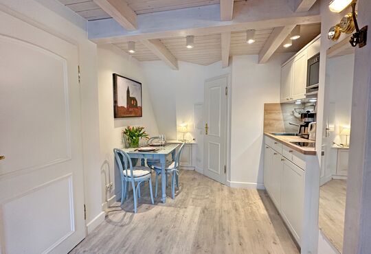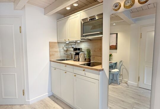 Küchenzeile im Wohnraum mit Ceranfeld (2 Kochstellen), Geschirrspüler, Mikrowelle/Grill, Kaffeemaschine, Wasserkocher, Toaster.