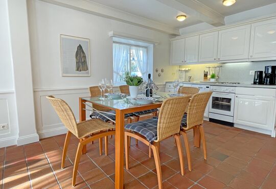 Küchenzeile im Wohnraum mit Kochfeld (4 Kochplatten), Geschirrspüler, Backofen, Kaffeemaschine, Wasserkocher, Toaster.