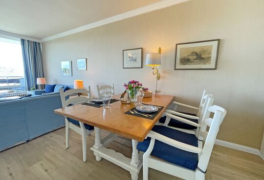 Westloggia mit Tisch und Stühlen.