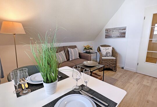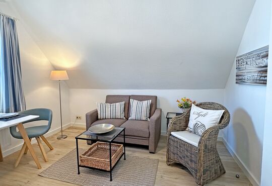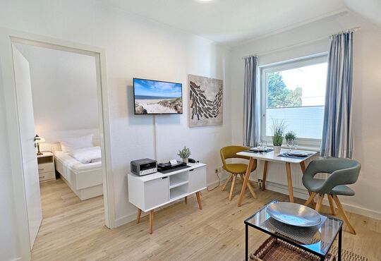 Wohnraum mit Sat-TV, Blu-ray-Player, Radio, Internetzugang.