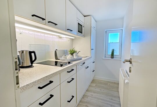 Küche mit Ceranfeld (2 Kochstellen), Geschirrspüler, Mikrowelle, Kaffeemaschine, Wasserkocher, Toaster.