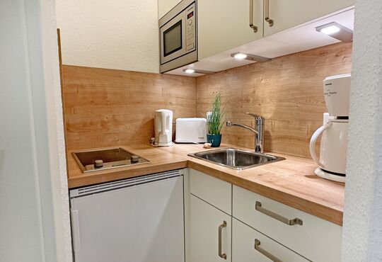 Küchenzeile mit Ceranfeld (2 Kochstellen), Mikrowelle, Kaffeemaschine, Wasserkocher, Toaster.