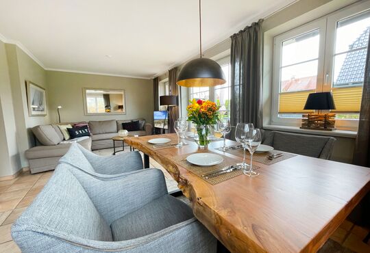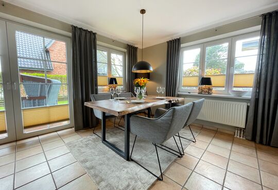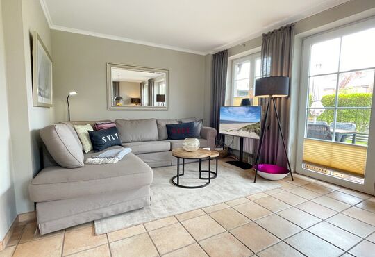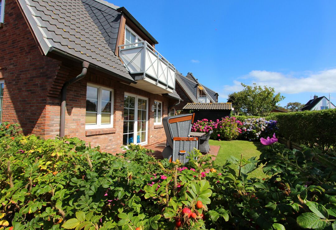 Südterrasse mit Tisch und Stühlen, Strandkorb (April-Oktober).