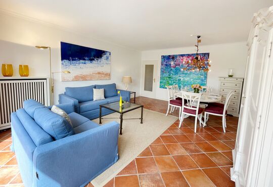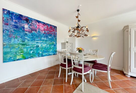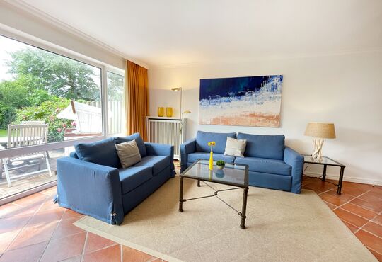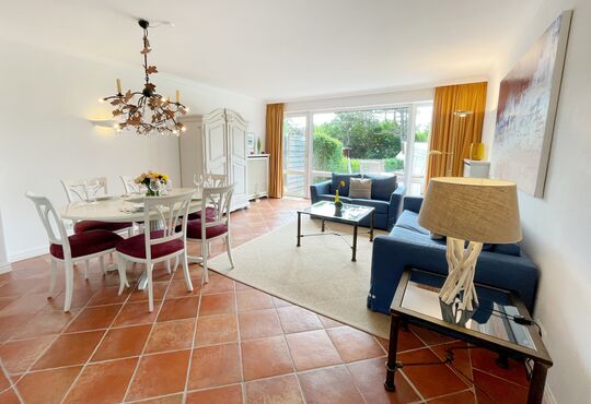 Wohnraum mit Kabel-TV, Radio, CD-Player, DVD-Player. Internetzugang. Südterrasse mit Tisch und Stühlen.