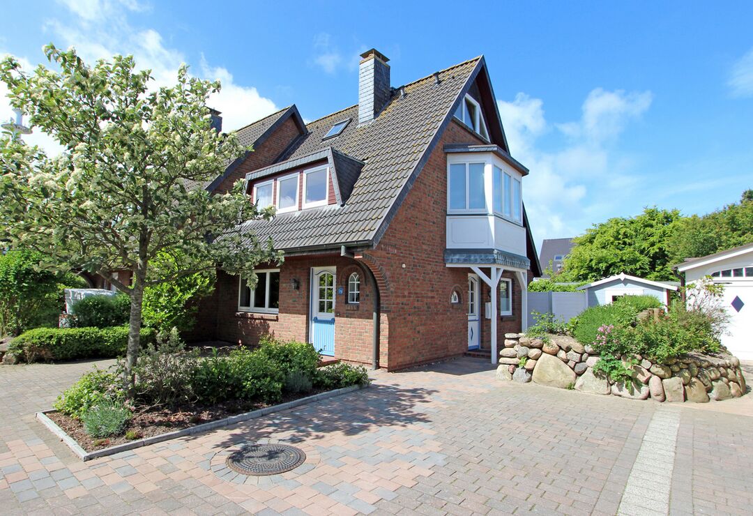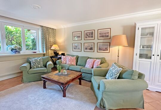 Gartenbereich mit Westterrasse mit Tisch und Stühlen, Strandkorb (April-Oktober).