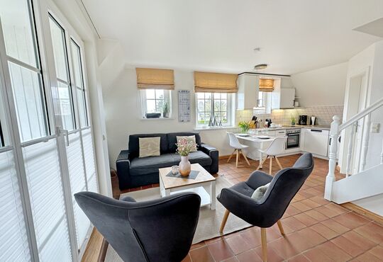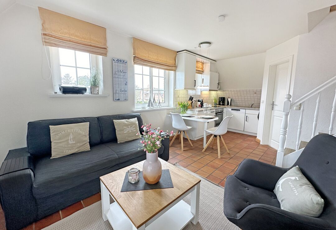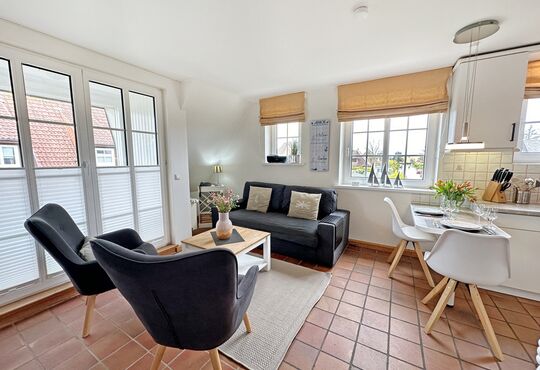 Wohnraum mit Schlafcouch (140x200), Kabel-TV, Radio, CD-Player, Telefon mit Flatrate (nur Gespräche ins dt. Festnetz möglich!), Internetzugang. Südloggia mit Tisch und Stühlen.