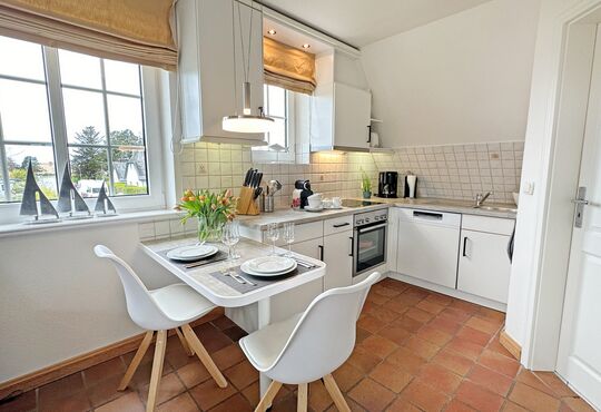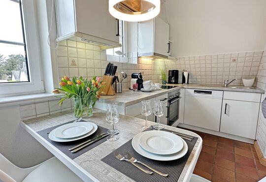 Küchenzeile im Wohnraum mit Ceranfeld (4 Kochstellen), Backofen, Geschirrspüler, Kaffeemaschine, Wasserkocher, Toaster.
