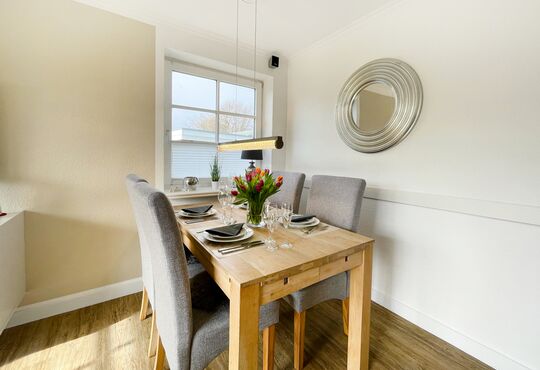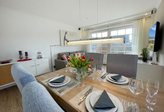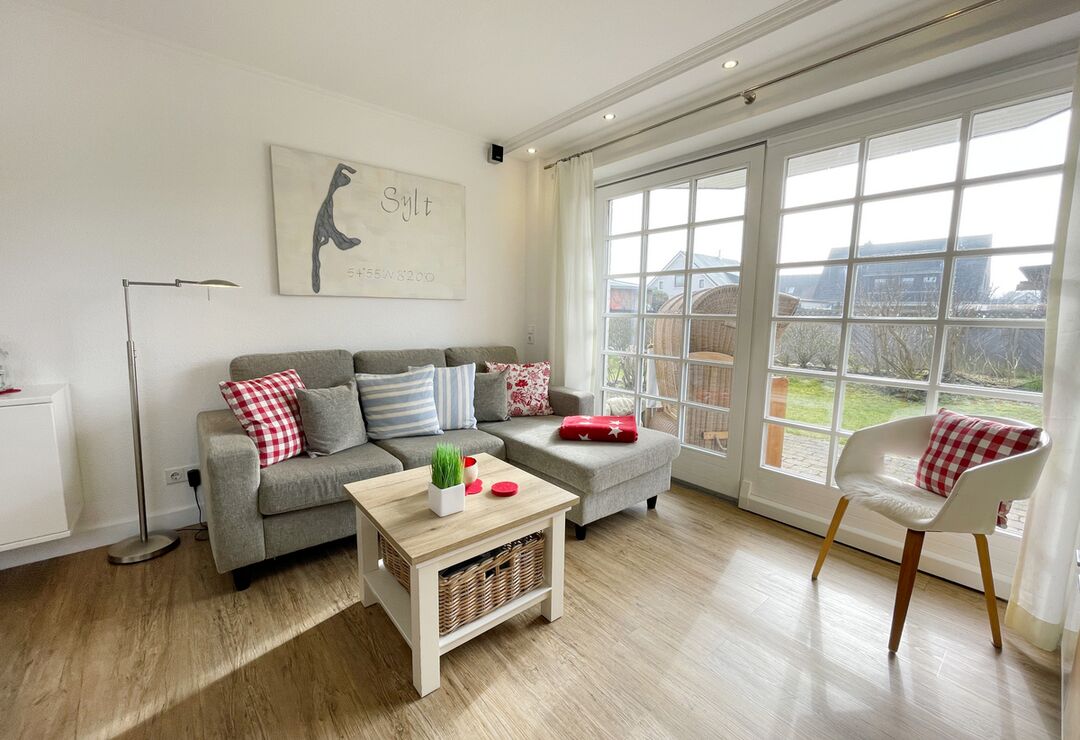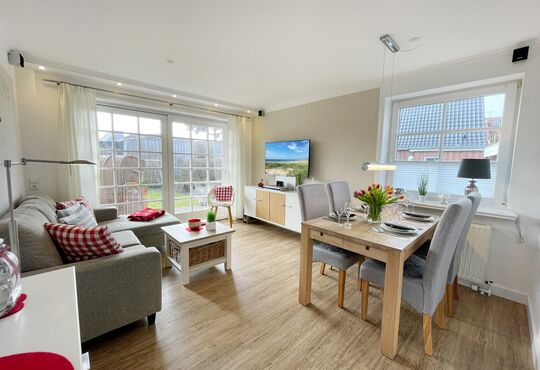 Südterrasse mit Tisch und Stühlen, Strandkorb (April-Oktober).
