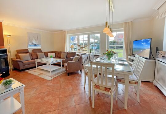 Wohnraum mit Kabel-TV, Radio, Kaminofen, Telefon mit Flatrate (nur Gespräche ins dt. Festnetz möglich!),