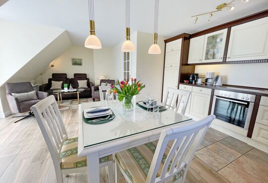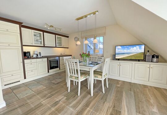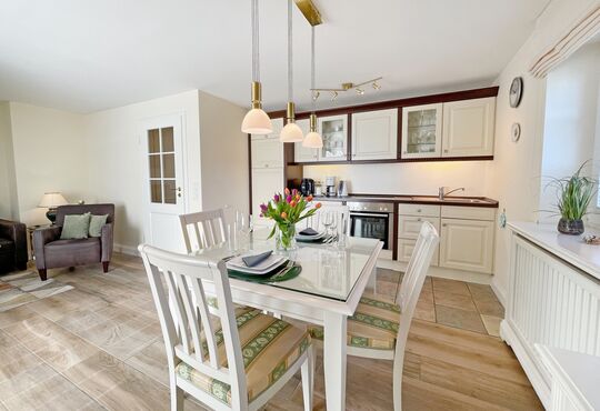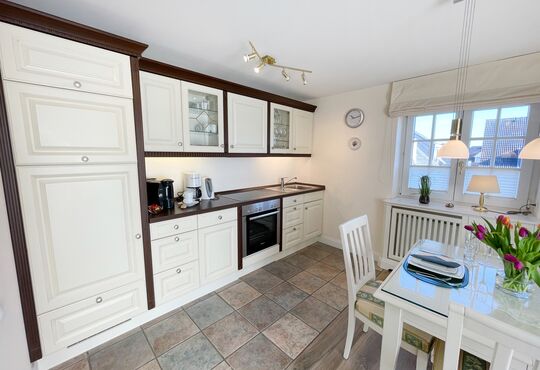 Küchenzeile im Wohnraum mit Ceranfeld (4 Kochstellen), Backofen, Mikrowelle, Geschirrspüler, Kaffeemaschine, Wasserkocher, Toaster.