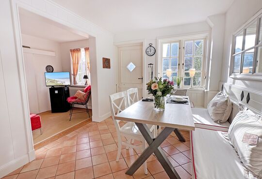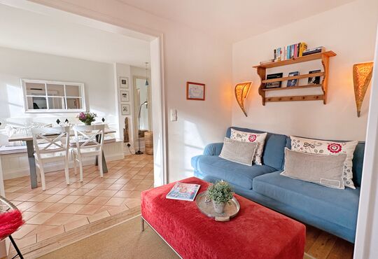 Wohnraum mit Kabel-TV, Radio, Internetzugang, Westterrasse mit Tisch und Stühlen. Gartenbereich.