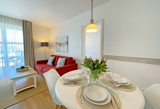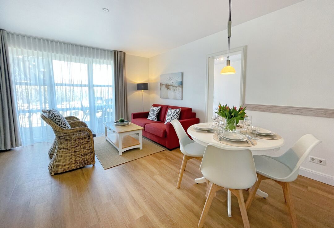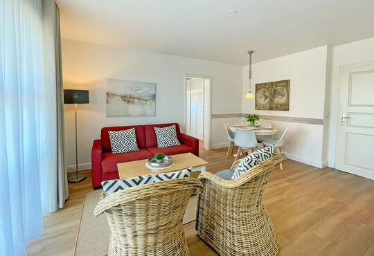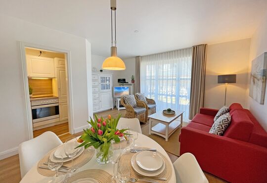 Wohnraum mit Kabel-TV, Radio-/CD-Player, Internetzugang. Westerrasse mit Tisch und Stühlen, Strandkorb (April - Oktober).