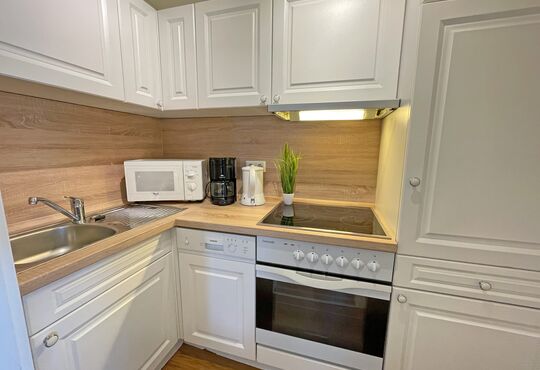 Küche mit Ceranfeld (4 Kochstellen), Backofen, Mikrowelle, Geschirrspüler, Kaffeemaschine, Wasserkocher, Toaster.