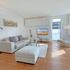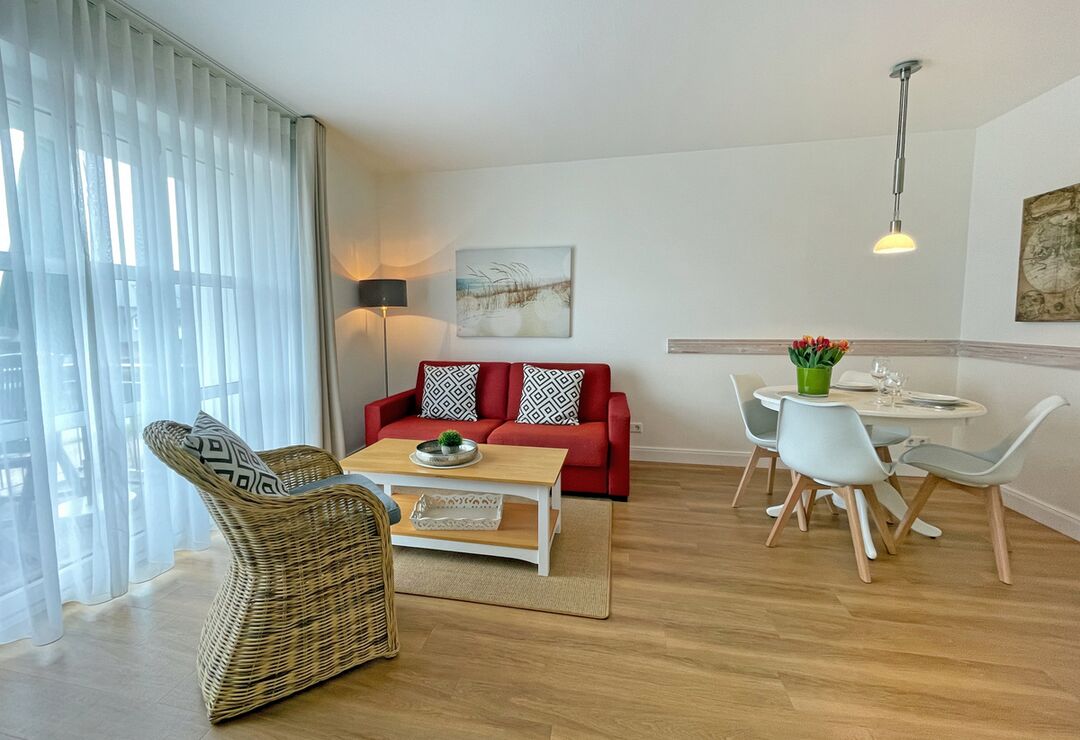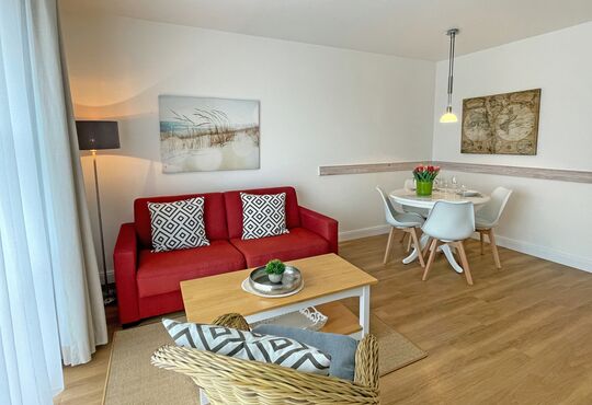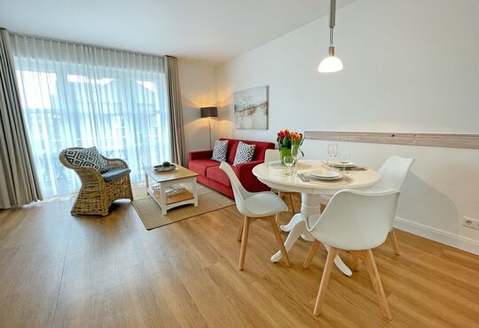 Wohnraum mit Kabel-TV, Radio-/CD-Player, Internetzugang. Westbalkon mit Tisch und Stühlen.