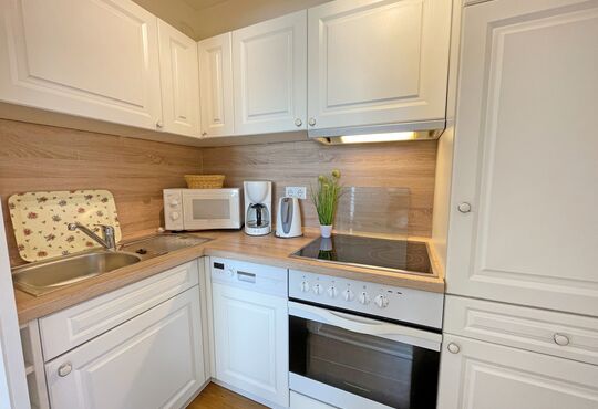 Küche mit Ceranfeld (4 Kochstellen), Backofen, Mikrowelle, Geschirrspüler, Kaffeemaschine, Wasserkocher, Toaster.
