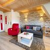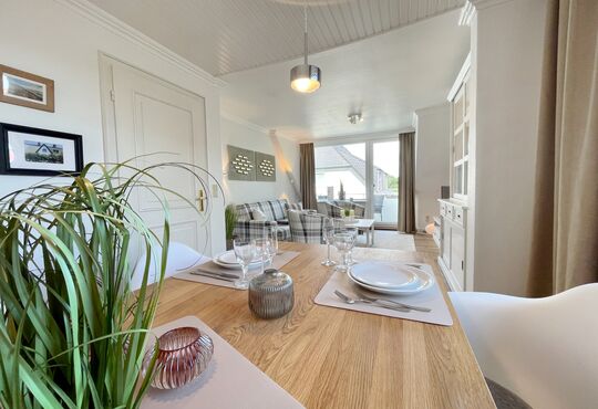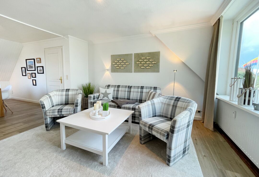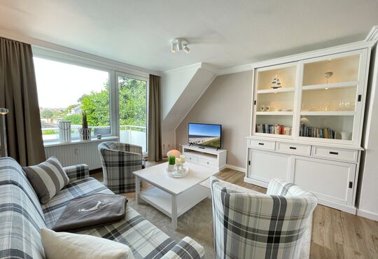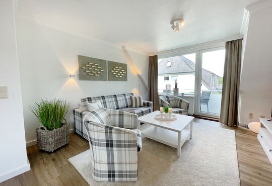 Wohnraum mit Schlafcouch, Kabel-TV, Radio/CD-Player, Internetzugang. Westbalkon mit Tisch und Stühlen.