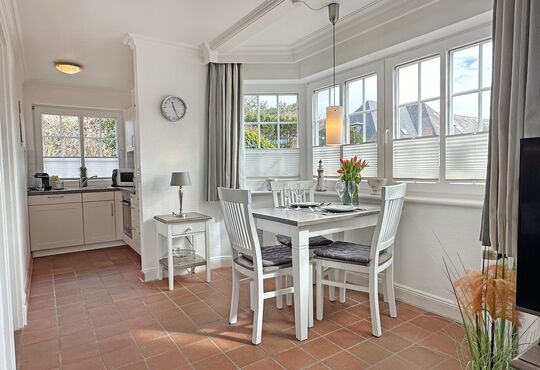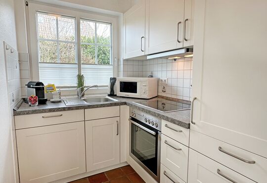 Küche im Wohnraum mit Ceranfeld (4 Kochstellen), Backofen, Mikrowelle, Geschirrspüler, Kaffeemaschine, Wasserkocher, Toaster, Nespressomaschine.