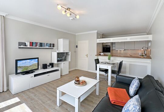Wohnraum mit Kabel-TV, Radio-/CD-Player, Internetzugang. Südloggia mit Tisch und Stühlen.