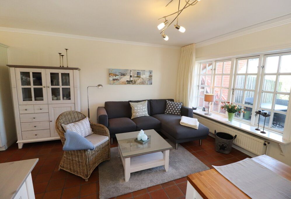 Westterrasse mit Tisch und Stühlen, Strandkorb (April-Oktober).