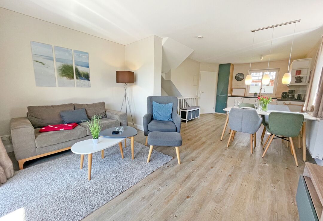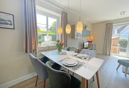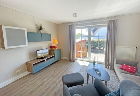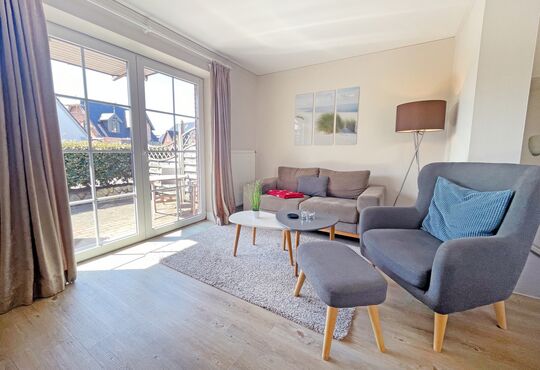 Wohnraum mit Kabel-TV, Radio, Internetzugang. Südterrasse mit Tisch und Stühlen, Strandkorb (April-Oktober).
