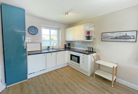 Küchenzeile im Wohnraum mit Ceranfeld (4 Kochstellen), Backofen, Geschirrspüler, Kaffeemaschine, Wasserkocher, Toaster.