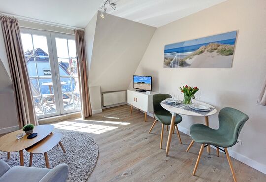 Südbalkon mit Tisch und Stühlen.