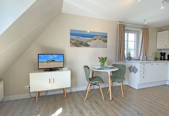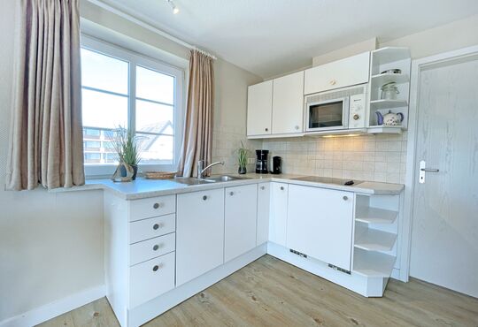 Küchenzeile im Wohnraum mit Ceranfeld (4 Kochstellen), Geschirrspüler, Mikrowelle, Kaffeemaschine, Wasserkocher, Toaster.