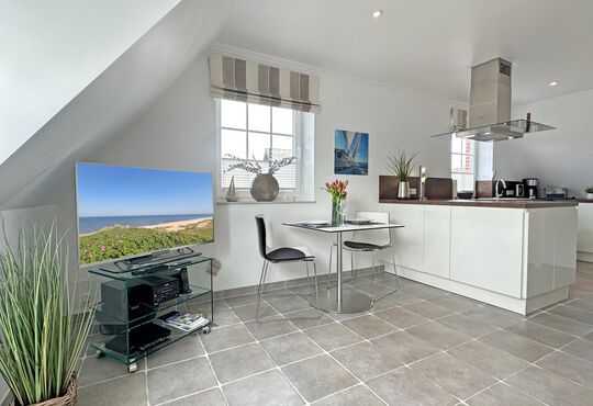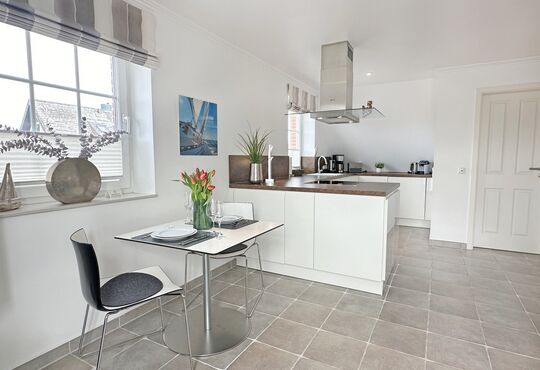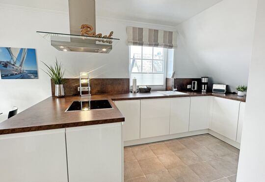Küche im Wohnbereich mit Ceranfeld (4 Kochstellen), Backofen, Geschirrspüler, Kühlschrank, Kaffeemaschine, Nespressomaschine, Wasserkocher, Toaster, Waschmaschine/Trockner.