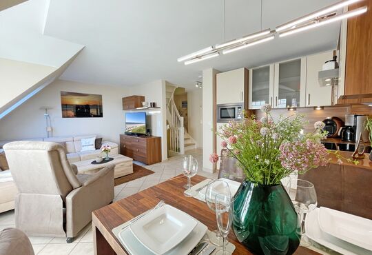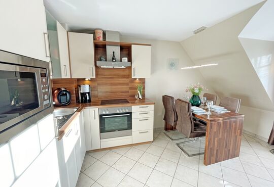 Küchenzeile im Wohnraum mit Ceranfeld (4 Kochstellen), Geschirrspüler, Backofen, Mikrowelle, Kaffeemaschine, Wasserkocher, Toaster.