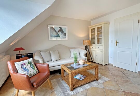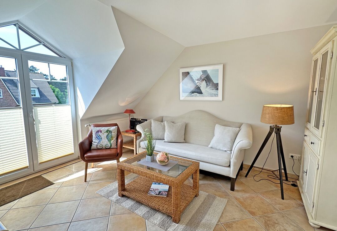 Wohnraum mit Kabel-TV, Radio-/CD-Player, Internetzugang. Südbalkon mit Tischund Stühlen (April-Oktober).
