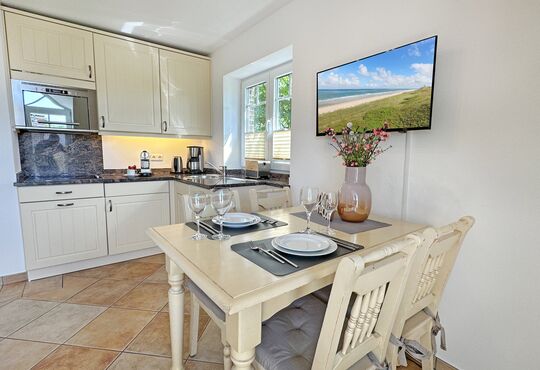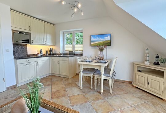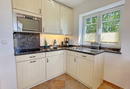 Küchenzeile im Wohnraum mit Ceranfeld (4 Kochstellen), Mikrowelle/Grill, Geschirrspüler, Kaffeemaschine, Wasserkocher, Toaster, Nespressomaschine.