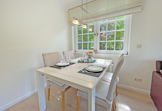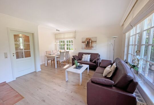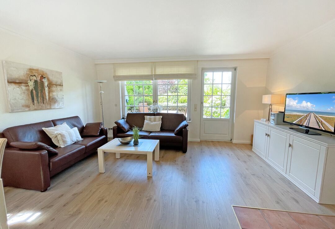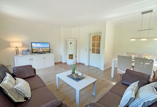 Wohnraum mit Kabel-TV, Radio/CD-Player, Kachelofen, Telefon mit Flatrate (nur Gespräche ins dt. Festnetz möglich!), Internetzugang. Westterrasse mit Tisch und Stühlen.