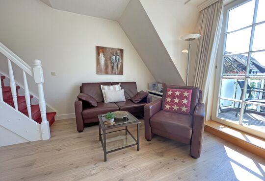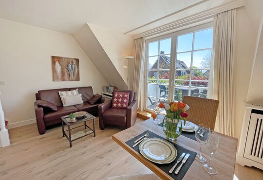 Wohnraum mit Kabel-TV, Radio/CD-Player, Telefon mit Flatrate (nur Gespräche ins dt. Festnetz möglich!), Internetzugang. Westbalkon mit Tisch und Stühlen.