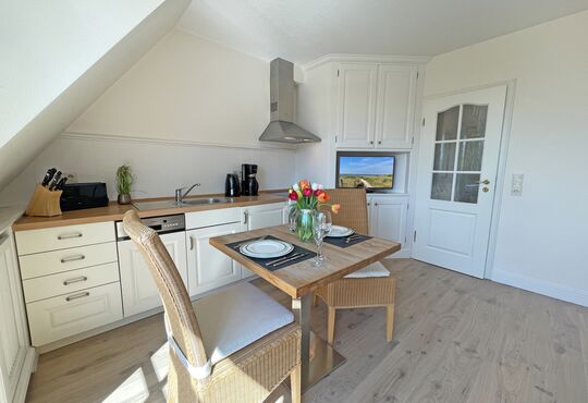 Küchenzeile im Wohnraum mit Ceranfeld (4 Kochstellen), Geschirrspüler, Mikrowelle/Grill, Kaffeemaschine, Wasserkocher, Toaster.