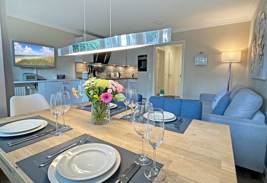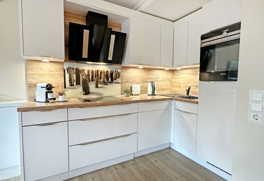 Küche im Wohnraum mit Induktionskochfeld (4 Kochstellen), Backofen, Mikrowelle, Geschirrspüler, Kaffeemaschine, Wasserkocher, Toaster, Nespressomaschine.