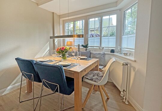 Südterrasse mit Tisch und Stühlen. Strandkorb (April-Oktober).