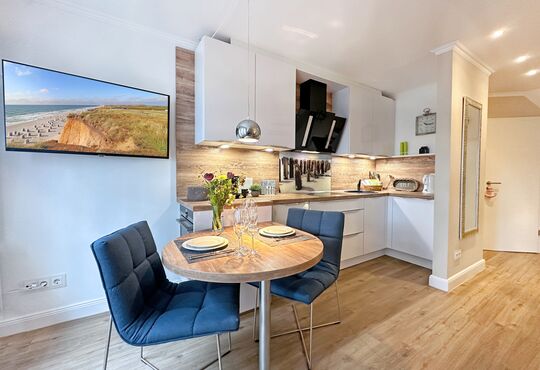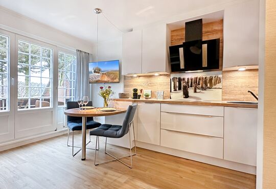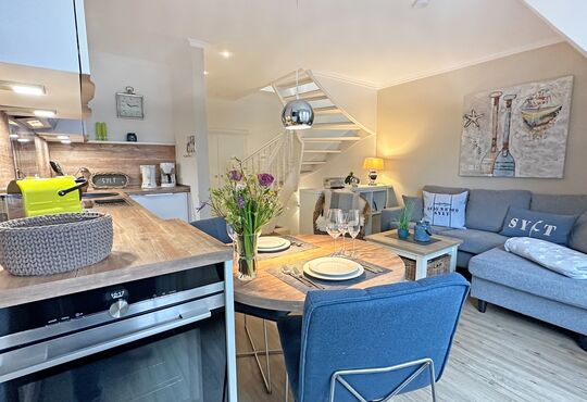Küche im Wohnraum mit Induktionskochfeld (4 Kochstellen), Backofen, Mikrowelle, Geschirrspüler, Kaffeemaschine, Wasserkocher, Toaster, Nespressomaschine.