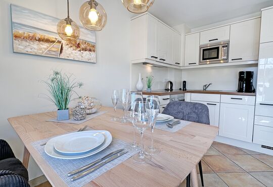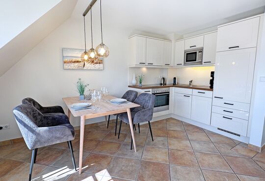 Küchenzeile im Wohnraum mit Ceranfeld (4 Kochstellen), Geschirrspüler, Backofen, Mikrowelle, Kaffeemaschine, Wasserkocher, Toaster, Nespressomaschine.