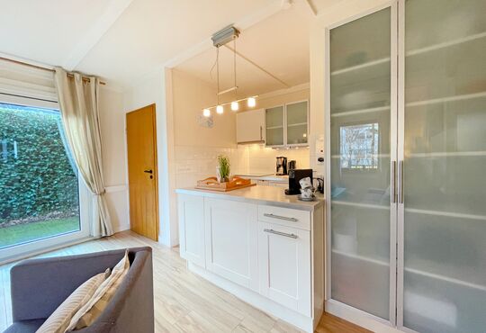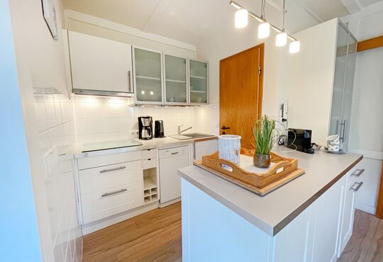 Küchenzeile im Wohnraum mit Ceranfeld (4 Kochstellen), Geschirrspüler, Waschmaschine, Kaffeemaschine, Wasserkocher, Toaster, Nespressomaschine.