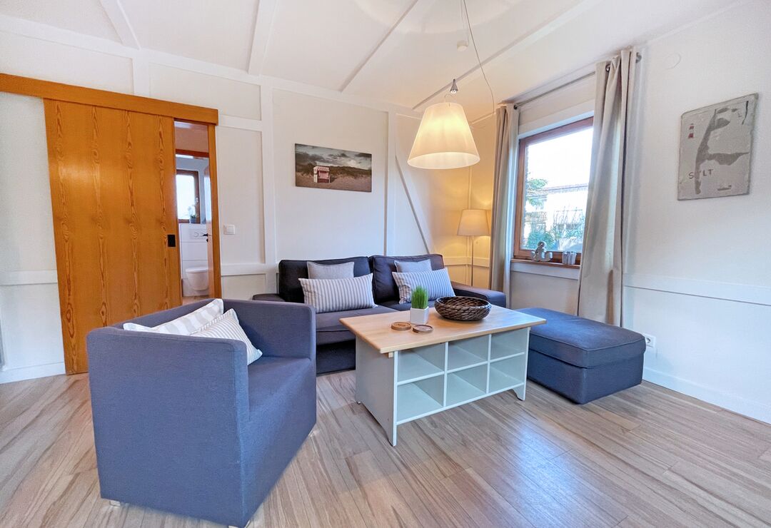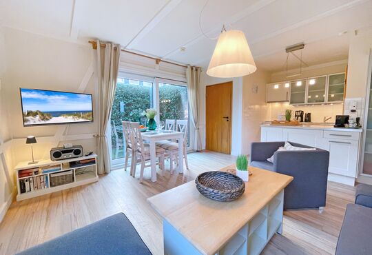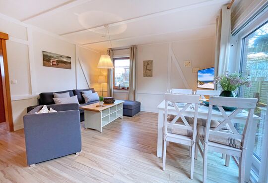 Wohnraum mit Kabel-TV, Sound-Anlage, Telefon mit Flatrate (nur Gespräche ins dt. Festnetz möglich), Internetzugang.