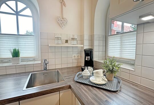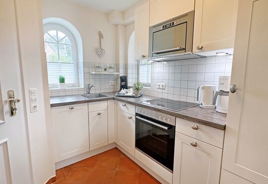 Küche mit Ceranfeld (4 Kochstellen), Backofen, Mikrowelle, Geschirrspüler, Kaffeemaschine, Wasserkocher, Toaster.