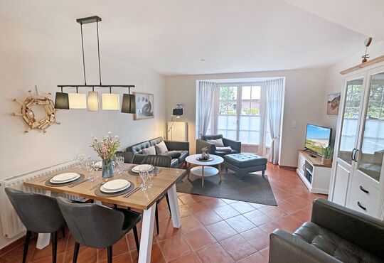 Wohnraum mit Kabel-TV, Radio/CD-Player, Internetzugang, Südterrasse mit Tisch und Stühlen,