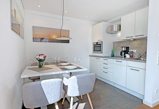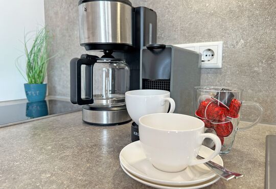 Einbauküche mit Ceranfeld (2 Induktionskochstellen), Geschirrspüler, Backofen, Kaffeemaschine, Wasserkocher, Toaster, Nespressomaschine.