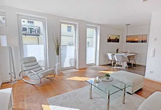 Ausgang zum südseitig gelegenen Balkon mit Tisch und Stühlen.