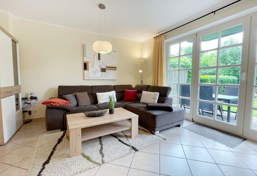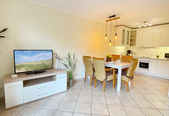 Wohnraum mit Kabel-TV, Radio, Telefon mit Flatrate (nur Gespräche ins dt. Festnetz möglich!), Internetzugang.