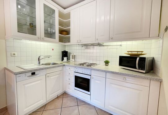 Küchenzeile im Wohnraum mit Kochfeld (4 Kochplatten), Backofen, Geschirrspüler, Mikrowelle, Kaffeemaschine, Wasserkocher, Toaster.