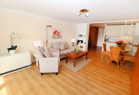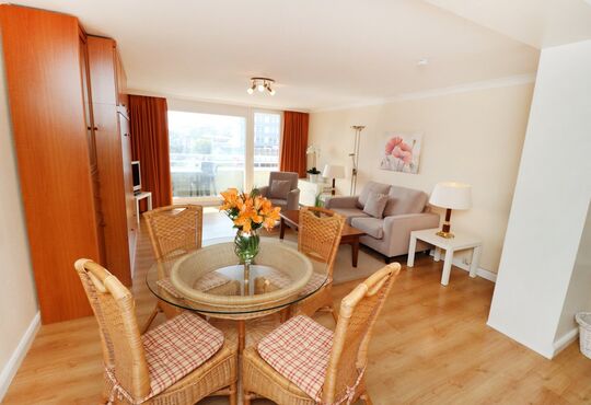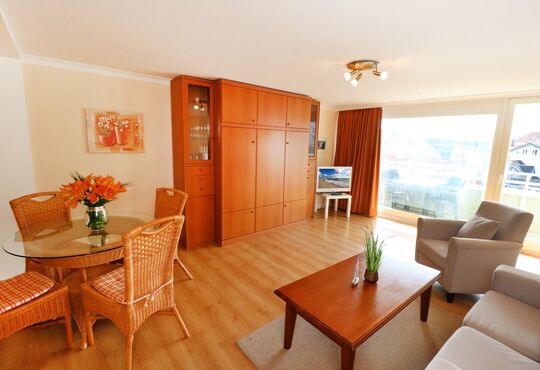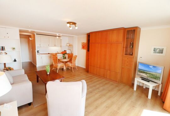 Wohnraum mit Doppelschrankbett (160x200), Kabel-TV, Radio, CD-Player, Telefon mit Flatrate (nur Gespräche ins dt. Festnetz möglich!), Internetzugang. Westloggia mit Tisch und Stühlen.