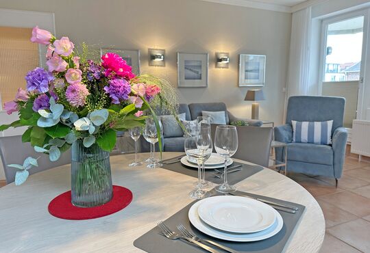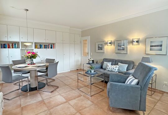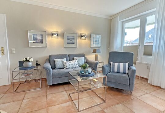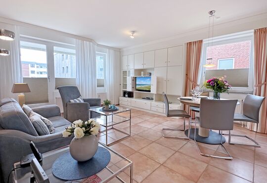 Wohnraum mit Kabel-TV, Radio, Telefon mit Flatrate (nur Gespräche ins dt. Festnetz möglich!), Internetzugang. Südseitiger Balkon mit Tisch und Stühlen.