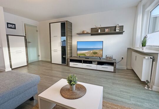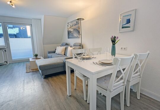 Wohnraum mit Schlafcouch, Kabel-TV, Radio, Internetzugang. Südbalkon mit Tisch und Stühlen.