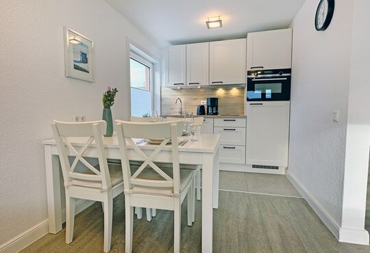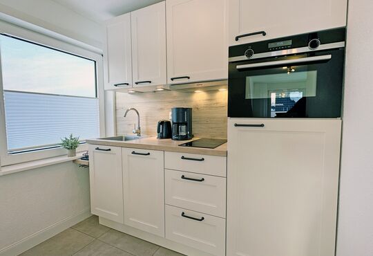 Küchenzeile im Wohnraum mit Ceranfeld (2 Kochstellen), Backofen/Mikrowelle, Geschirrspüler, Kaffeemaschine, Wasserkocher, Toaster.